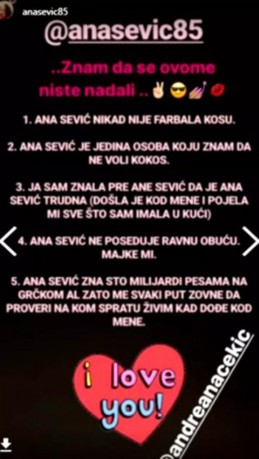 Pevačicu Anu Sević prijatelji su izazvali na društvenoj mreži Instagram da otkrije pet tajni o sebi. Međutim, Anu je to mrzelo da uradi, pa je umesto nje njene tajne otkrila kuma Andreana Čekić.