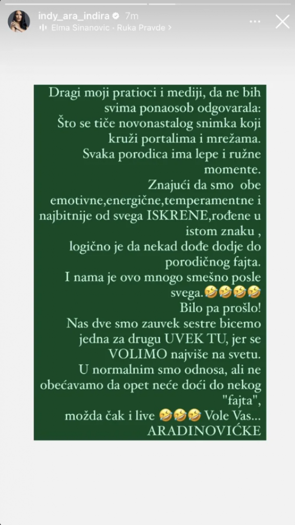 - Dragi moji pratioci i mediji, da ne bih svima ponaosob odgovarala: Što se tiče novonastalog snimka koji kruži portalima i mrežama... Svaka porodica ima lepe i ružne momente. Znajući da smo obe emotivne, energične, temperamentne i najbitnije od svega iskrene, rođene u istom znaku, logično je da nekad dođe do porodičnog fajta. I nama je ovo mnogo smešno posle svega. Bilo, pa prošlo! Nas dve smo zauvek sestre bićemo jedna za drugu uvek tu, jer se volimo najviše na svetu. U normalnim smo odnosima, ali ne obećavamo da opet neće do nekog "fajta", možda čak i lajv. Vole vas Aradinovićke - napisala je Indi na Instagramu.