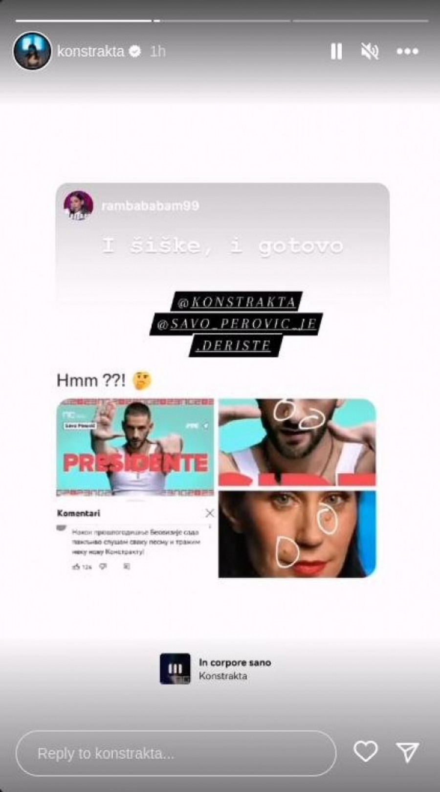 Savo Perović, otkako je pesma koja je nastala u saradnji sa Ivanom Rašić, poznatijom pod pseudonimom Sajsi MC, odmah se izdvojio kao favorit. Da li će publika deliti mišljenje Konstrakte i da li zaista vidi bilo kakvu povezanost sa pomenutim pevačem, saznaćemo na finalnoj večeri Pesme za Evroviziju početkom marta, kada će dati svoj konačni sud.