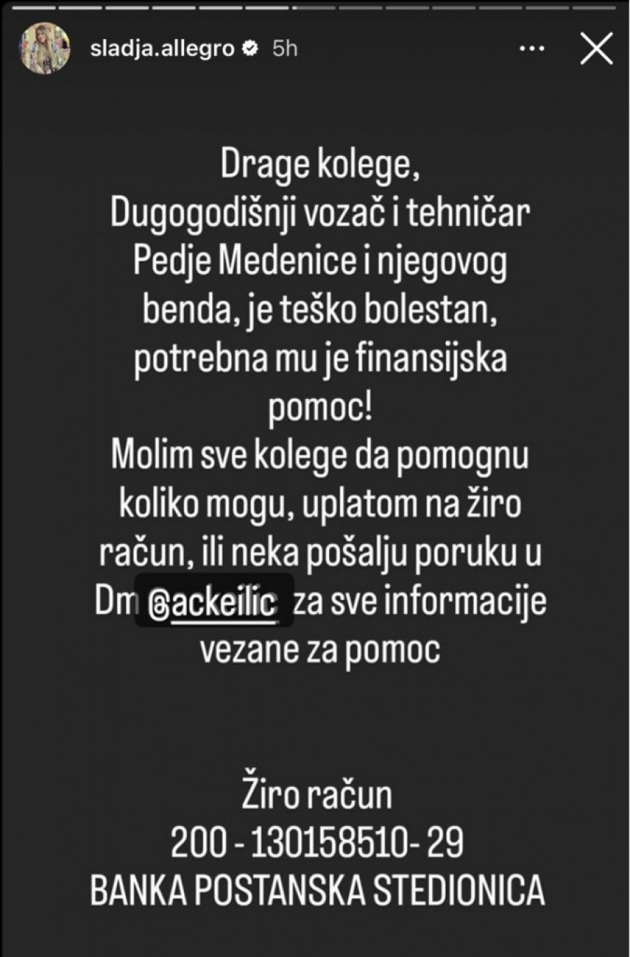 - Drage kolege, dugogodišnji vozač i tehničar Peđe Medenice i njegovog benda, je teško bolestan, potrebna mu je finansijska pomoć! Molim sve kolege da pomognu koliko mogu, uplatom na žiro račun ili neka pošalju poruku u DM za sve informacije vezane za pomoć - napisala je Slađa.