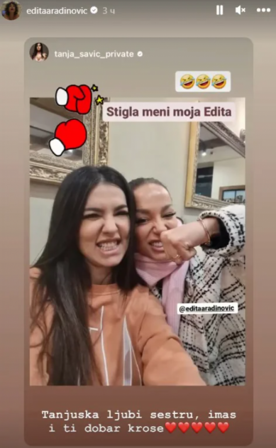Pevačica Edita Aradinović nedavno je bila u žiži javnog interesovanja, nakon što je isplivao snimak tuče sa sestrom Indirom Indi Aradinović, a sada je na svoj račun zbila šalu sa koleginicom Tanjom Savić. Naime, Tanja je objavila slefi fotografiju sa Editom, na kojoj koleginice poziraju nasmejane, dok je Aradinovićeva držala stegnutnu pesnicu blizu lica Savićeve.