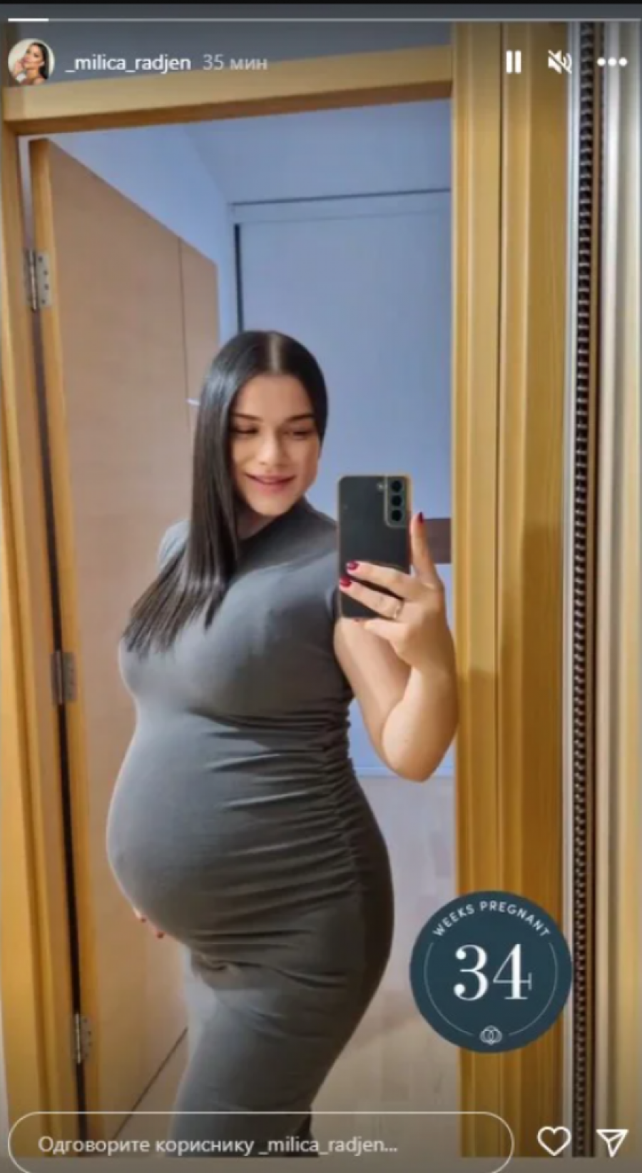 Pevačica je već tada bila u poodmakloj trudnoći, a par čeka sina. Milica je danas objavila stori na društvenoj mreži Instagram, gde je pokazala kako njen stomak izgleda u 34. nedelji trudnoće, a koliko je srećna što će uskoro postati majka govori njen izraz lica.