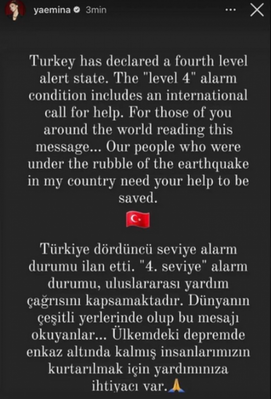 - Turska je proglasila četvrti nivo uzbune. Stanje alarma nivoa četiri uključuje međunarodni poziv za pomoć. Za sve vas širom sveta koji čitate ovu poruku. Našim ljudima koji su bili pod ruševinama zemljotresa u mojoj zemlji potrebna je vaša pomoć da bi se spasili - poručila je pevačica na Instagramu.