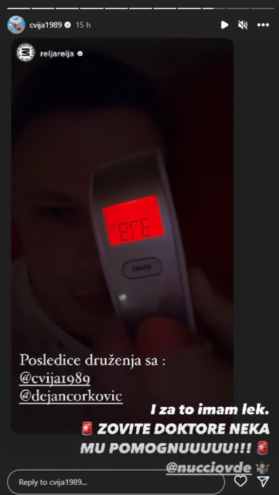 Sve to je podelio njegov kolega, reper Cvija na Instagramu, pa se našalio da se pozove hitno doktor. Relja se našalio i napisao da je temperatura usledila zbog kao posledica druženja sa Cvijom i još jednim drugom.