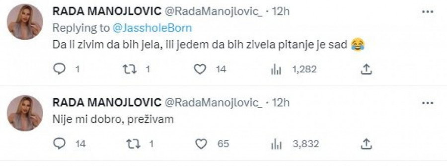 - Ova Rada stvarno nije normalna! Šta joj bi sad da objavljuje ovakve stvari? Ne znam kome može da bude smešno da neko propagira nezdrav način života. Razumem da je pokušala da ispadne duhovita i spontana, ali ovo je sve, samo nije to - glasio je jedan od komentara na Tviteru.