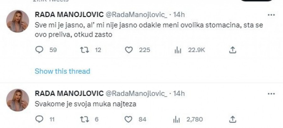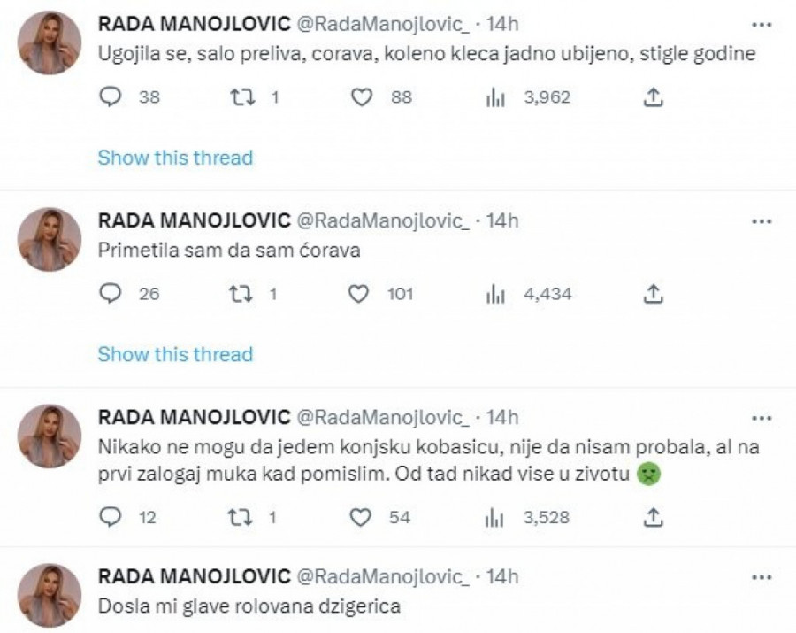 Pevačica Rada Manojlović šokirala je nakon što je na društvenoj mreži Tviter postavila nekoliko objava u kojima je sebe najstrašnije vređala, pa je pisala da je sad debela i ćorava pevačica, koja samo jede i deblja se. Naime, pevačica nekoliko dana zaredom postavlja čudne statuse i slike nezdrave hrane koju svakodnevno naručuje, pa dok jedni misle da je duhovito to što radi, drugi je prozivaju i pišu da se smesta zaustavi.