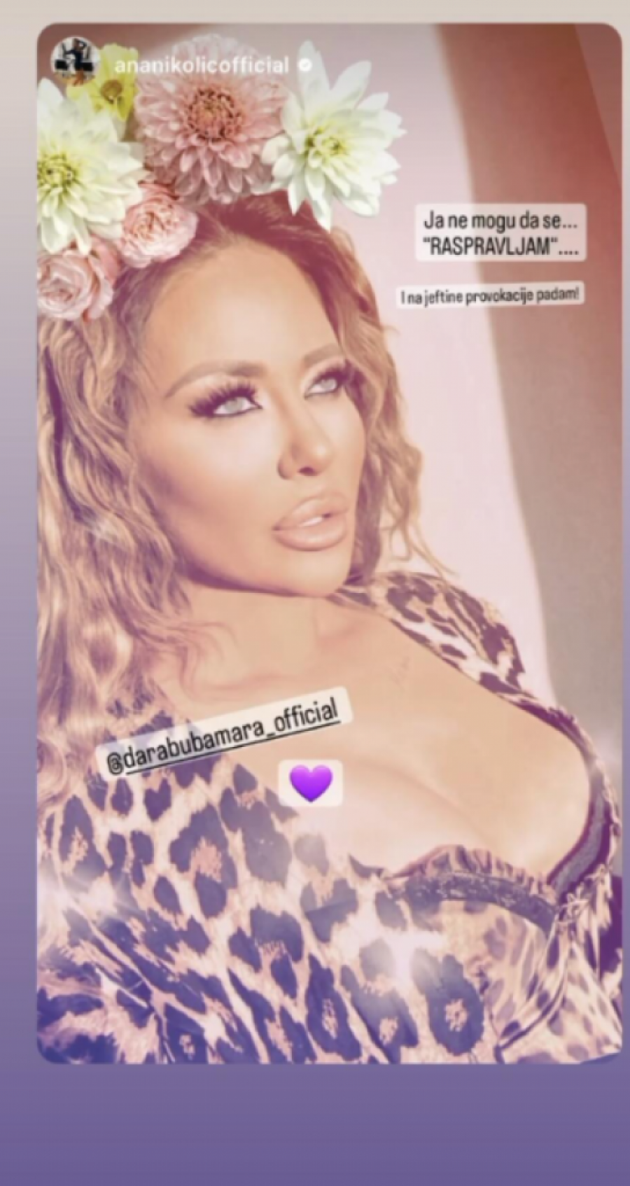 - Ja ne mogu da se raspravljam. I na jeftine provokacije padam - napisala je Ana, tagovala pevačicu i stavila srce, što je Dara postavila na svoj stori, te je jasno da njih dve nisu u svađi.