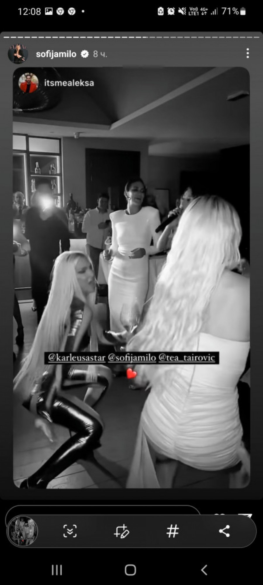 - Sofija je bila veoma raspoložena i celo veče je igrala i pevala. U jednom trenutku je sa Radom, Teom, Karleušom i Pavlovićkom zamešala kukovima i sve prisutne ostavile bez teksta. Devojke su bile odlično raspoložene i đuskale su sve vreme, a Tairovićeva je svojim, a i hitovima svojih koleginica podigla atmosferu do maksimuma. Jelena se u jednom trenutku popela na fotelju i pokazala kako uvija kukovima, a providnim kombinezonom koji je imala na sebi je dodatno skrenula pažnju, pa je izgledalo kao da je Mala od skandala želela slavljenici da ukrade šou - priča izvor s lica mesta za Republiku i dodaje da je žurka trajala do kasno u noć: