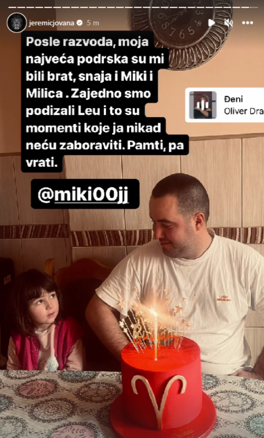 - Posle razvoda, moja najveća podrška su mi bili brat, snaja i Miki, i Milica. Zajedno smo podizali Leu i to su momenti koje ja nikad neću zaboraviti. Pamti, pa vrati - napisala je Jovana na Instagram storiju.