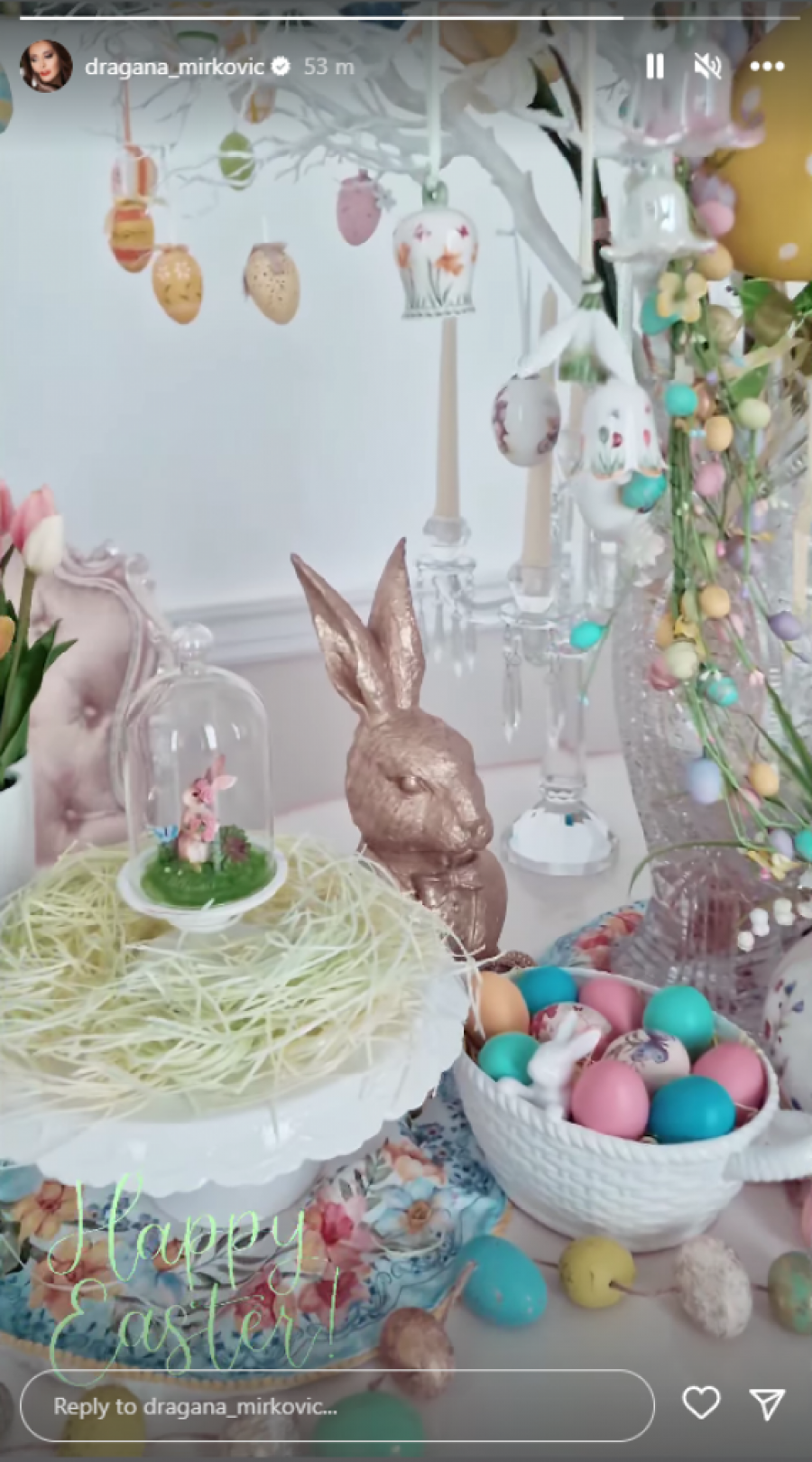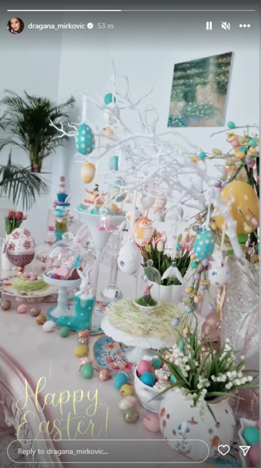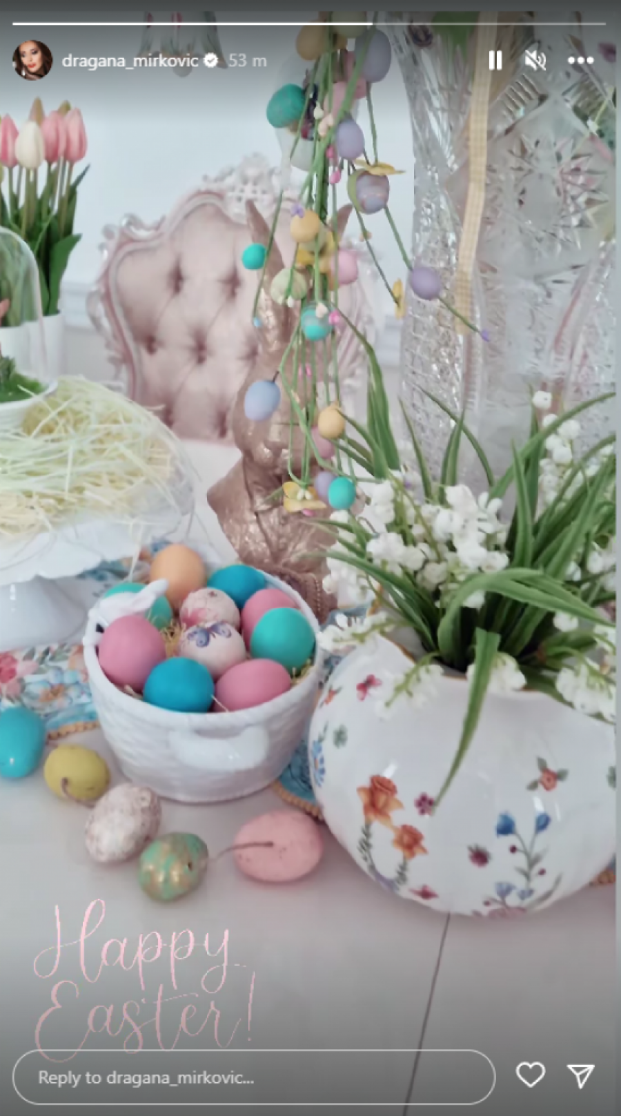 Naime, Dragana je na svom Instagramu podelila video snimak na kojem je pokazala prazničnu dekoraciju. Na stolu su poređani zečevi, šarena jaja i puno cveća.