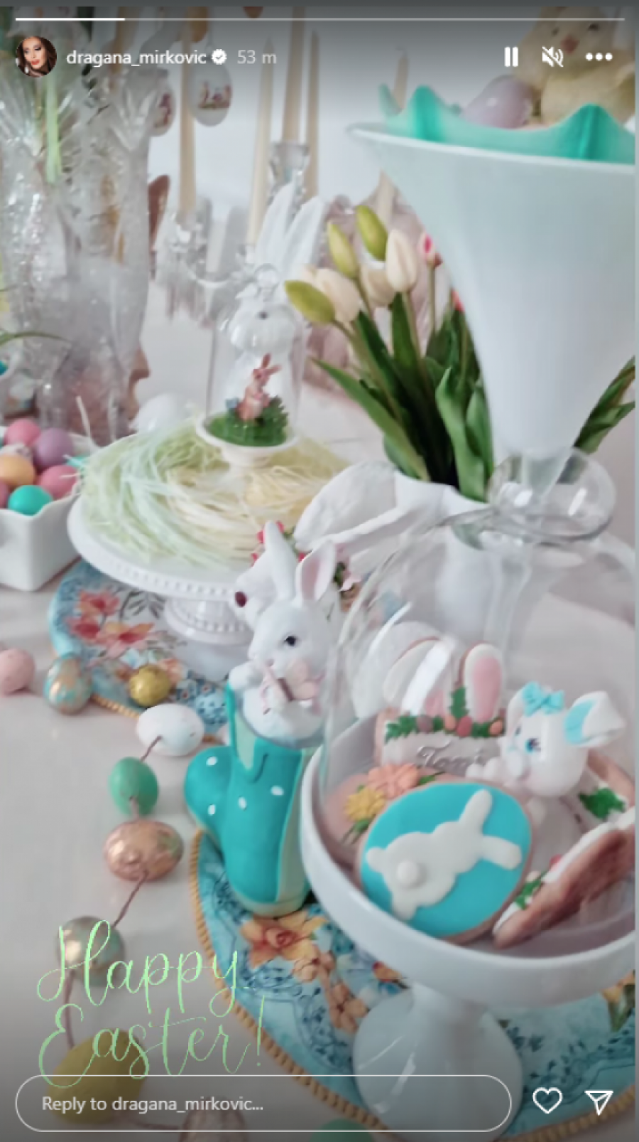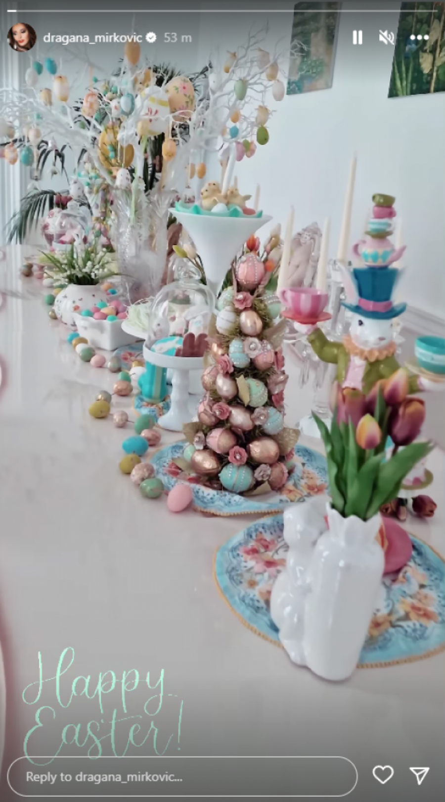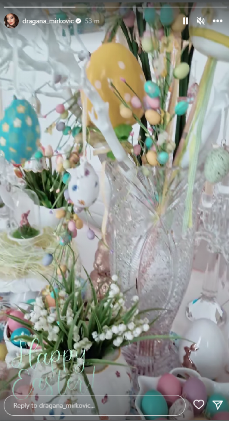 Naime, Dragana je na svom Instagramu podelila video snimak na kojem je pokazala prazničnu dekoraciju. Na stolu su poređani zečevi, šarena jaja i puno cveća.
