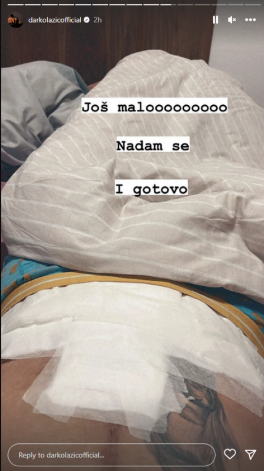 - Operisao sam stomak. Ne mogu da pevam pućiće mi konci. Oporavak ide dobro. Biće sve kako treba. Ljubav je lek za sve. Ovo moje će da zaraste kao kvasac. Moram da primim još jednu terapiju. Rano ustajem da primim još jednu terapiju. Stiže doktor - rekao je Darko nakon čega se isključio iz lajva.
