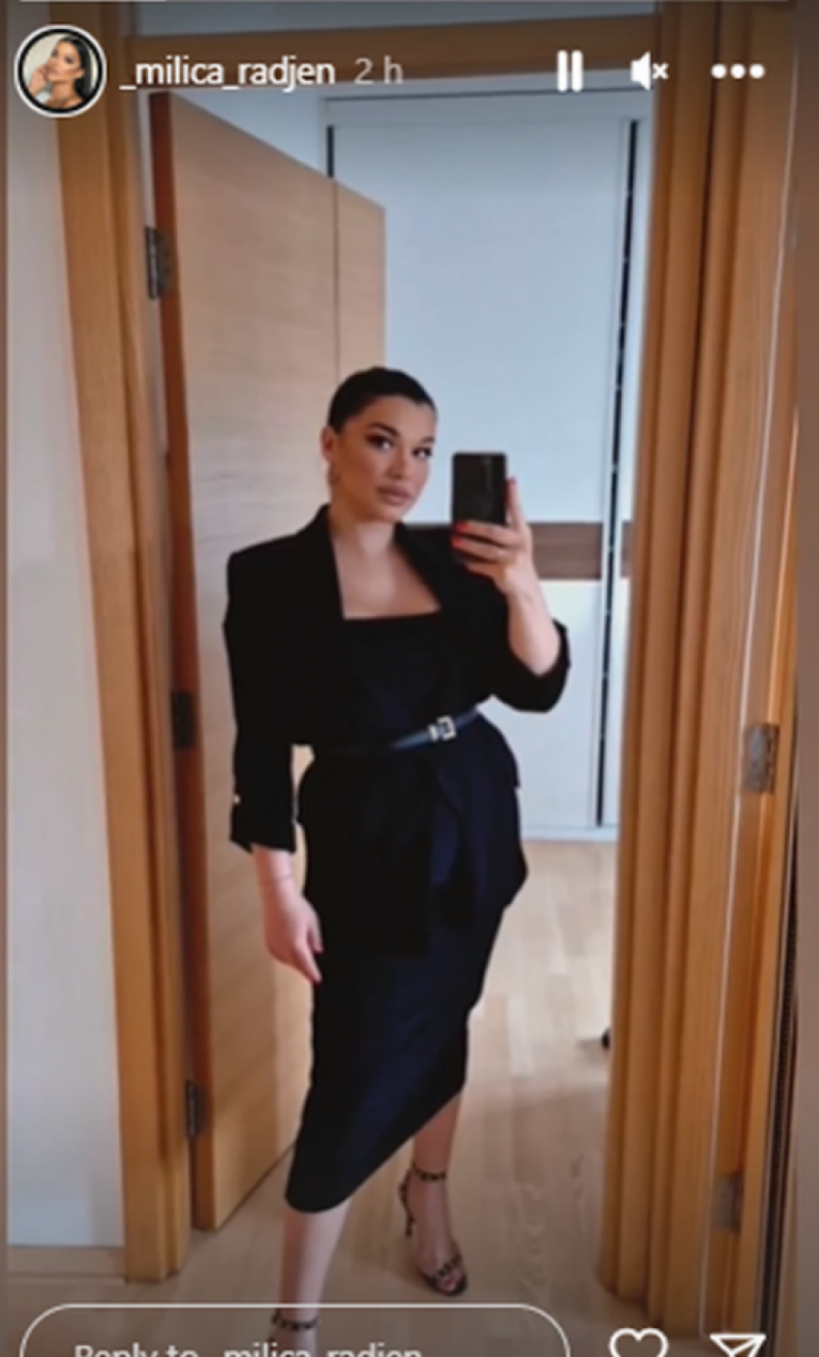 Naime, Milica je pozirala u crnoj dužoj haljini sa dekolteom, dok je preko imala sako i kao modni detalj stavila kaiš, kojim je dodatno istakla struk, a sve je upotpunila štiklama.