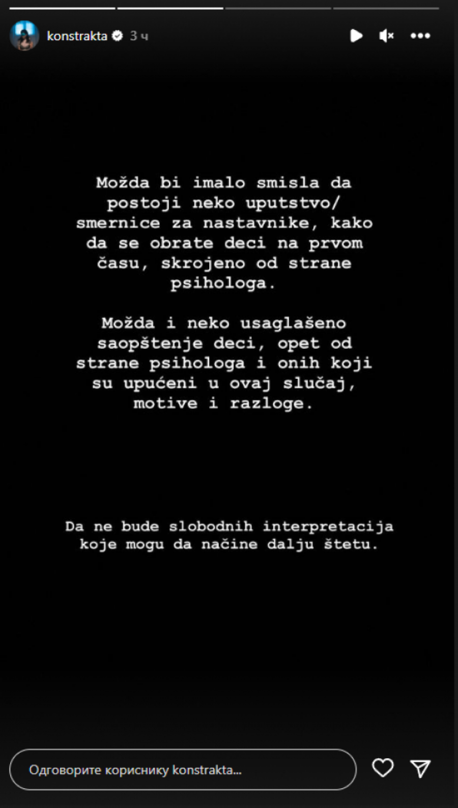 - Možda bi imalo smisla da postoji neko uputstvo/smernice za nastavnike, kako da se obrate deci na prvom času, skrojeno od strane psihologa. Možda i neko usaglašeno saopštenje deci, opet od strane psihologa i onih koji su upućeni u ovaj slučaj, motive i razloge. Da ne bude slobodnih interpretacija koje mogu da načine dalju štetu - napisala je Konstrakta.