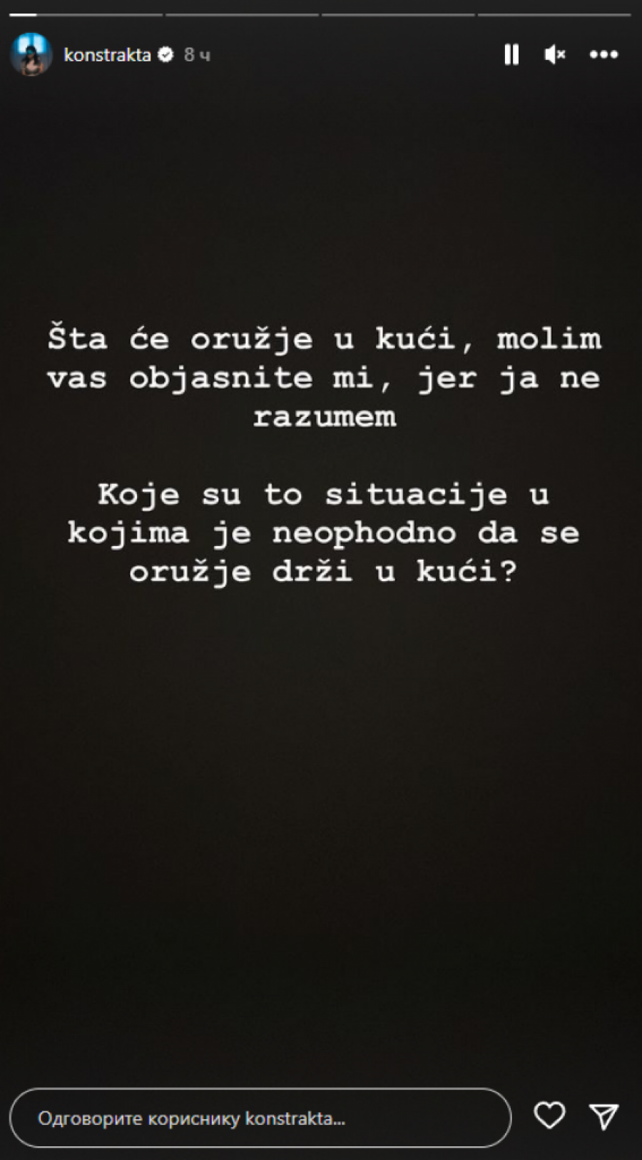 - Šta će oružje u kući, molim vas objasnite mi, jer ja ne razumem. Koje su to situacije u kojima je neophodno da se oružje drži u kući? - zapitala se Konstrakta, koja je dodala: