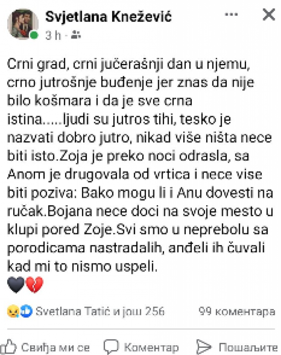 - Crni grad, crni jučerašnji dan u njemu, crno jutrošnje buđenje jer znaš da nije bilo košmara i da je sve crna istina.. Ljudi su jutros tihi, teško je nazvati dobro jutro, nikad više ništa neće biti isto. Zoja je preko noći odrasla, sa Anom je drugovala od vrtića i neće više biti poziva: Bako, mogu li i Anu dovesti na ručak. Bojana neće doći na svoje mesto u klupi pored Zoje. Svi smo u neprebolu sa porodicama nastradalih, anđeli ih čuvali kad mi to nismo uspeli - napisala je neutešna glumica.