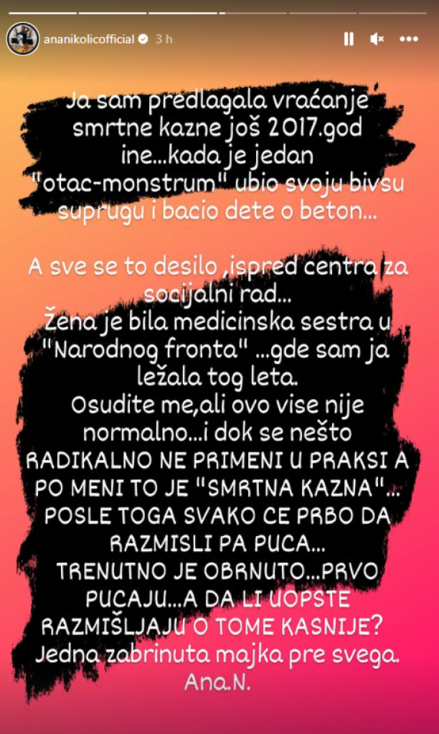 - Ja sam predlagala vraćanje smrtne kazne još 2017. godine... Kada je jedan "otac monstrum" ubio svoju bivšu suprugu i bacio dete o beton... A sve se to desilo, ispred Centra za socijalni rad. Žena je bila medicinska sestra u ,,Narodnog fronta". Gde sam ja ležala tog leta. Osudite me, ali ovo više nije normalno i dok se nešto radikalno ne primeni u praksi, a pomeni to je ,,smrtna kazna". Posle toga svako će prvo da razmisli, pa puca. Trenutno je obrnuto. Prvo pucaju, a dali uopšte razmišljaju o tome kasnije? Jedna zabrinuta majka pre svega, Ana Nikolić - napisala je Ana Nikolić.