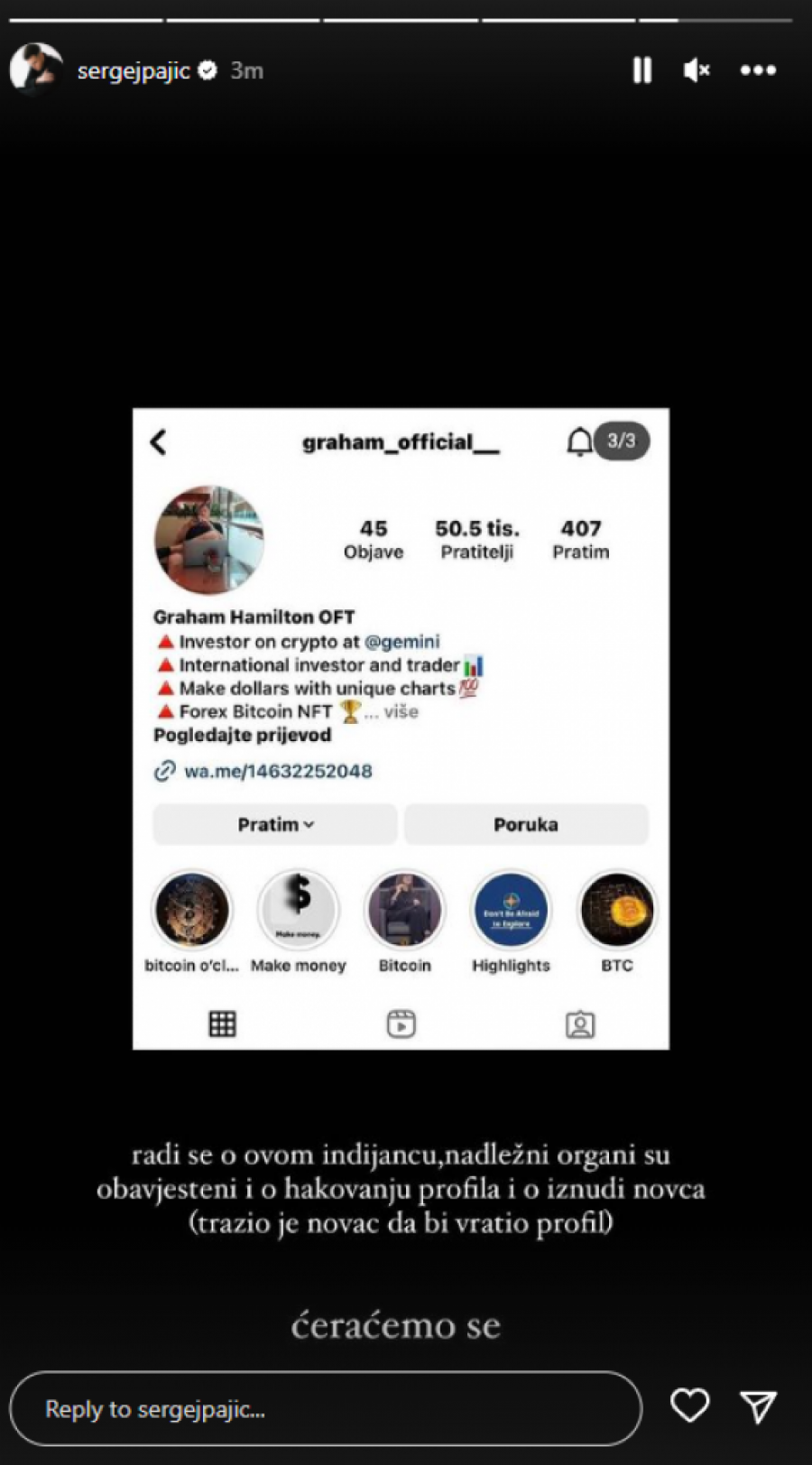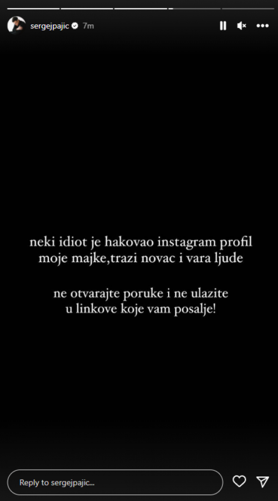 - Neki idiot je hakovao Instagram profil moje majke, traži novac i vara ljude. Ne otvarajte poruke i ne ulazite na linkove koje vam pošalje! - napisao je Sergej, podelio profil osobe i dodao: