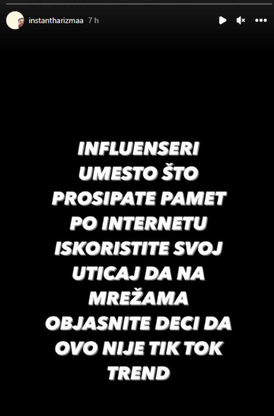- Influensere umesto što prosipate pamet po insternetu iskoristite svoje utican da na mrežama objanite deci da ovo nije TikTok trend - napisao je voditelj na Instagramu.