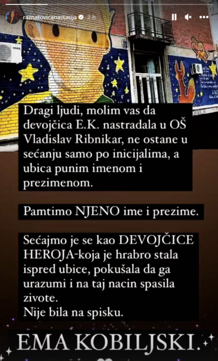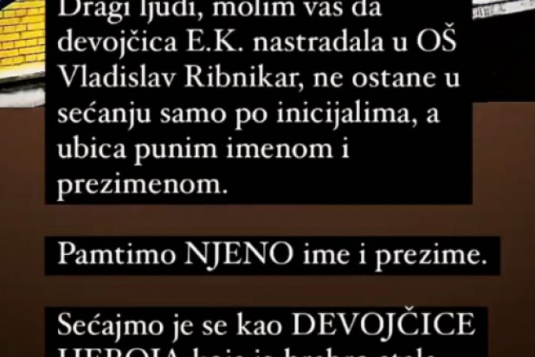 - Dragi ljudi, molim vas da devojčica E. K. nastradala u OŠ ,,Vladislav Ribnikar" ne ostane u sećanju samo po inicijalima, a ubica punim imenom i prezimenom. Pamtimo njeno ime i prezime. Sećajmo je se kao devojčice heroja koja je hrabro stala ispred ubice (dečaka ubice), pokušala da ga urazumi i na taj način spasila živote. Nije bila na spisku. Ema Kobiljski. - stoji na fotografiji koju su objavile mnoge poznate ličnosti, među kojima se našla i Milica Todorović.