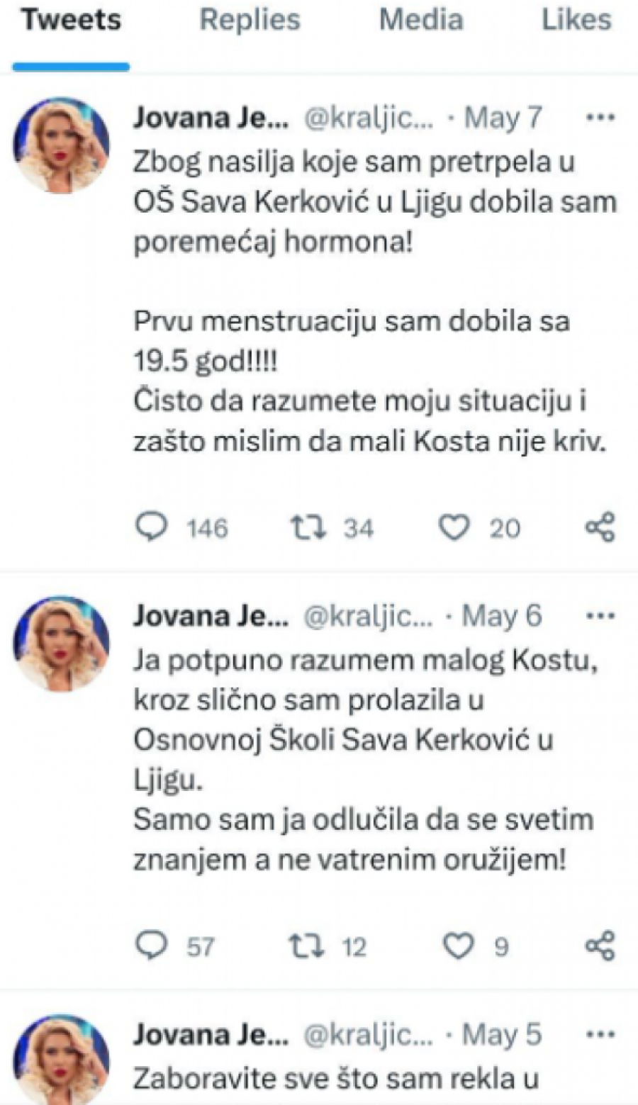 - Zbog nasilja koje sam pretrpela u OŠ ''Sava Kerković'' u Ljigu dobila sam poremećaj hormona. Prvu menstruaciju sam dobila sa 19,5 godina! Čisto da razumete moju situaciju i zato mislim da mali Kosta nije kriv - samo je jedan od statusa napisanih u Jovanino ime.