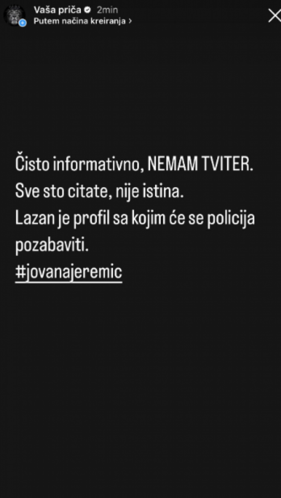 Ovim povodom se Jovana hitno oglasila i sve obavestila da ona nema Tviter, kao i da je o svemu obaveštena policija.
