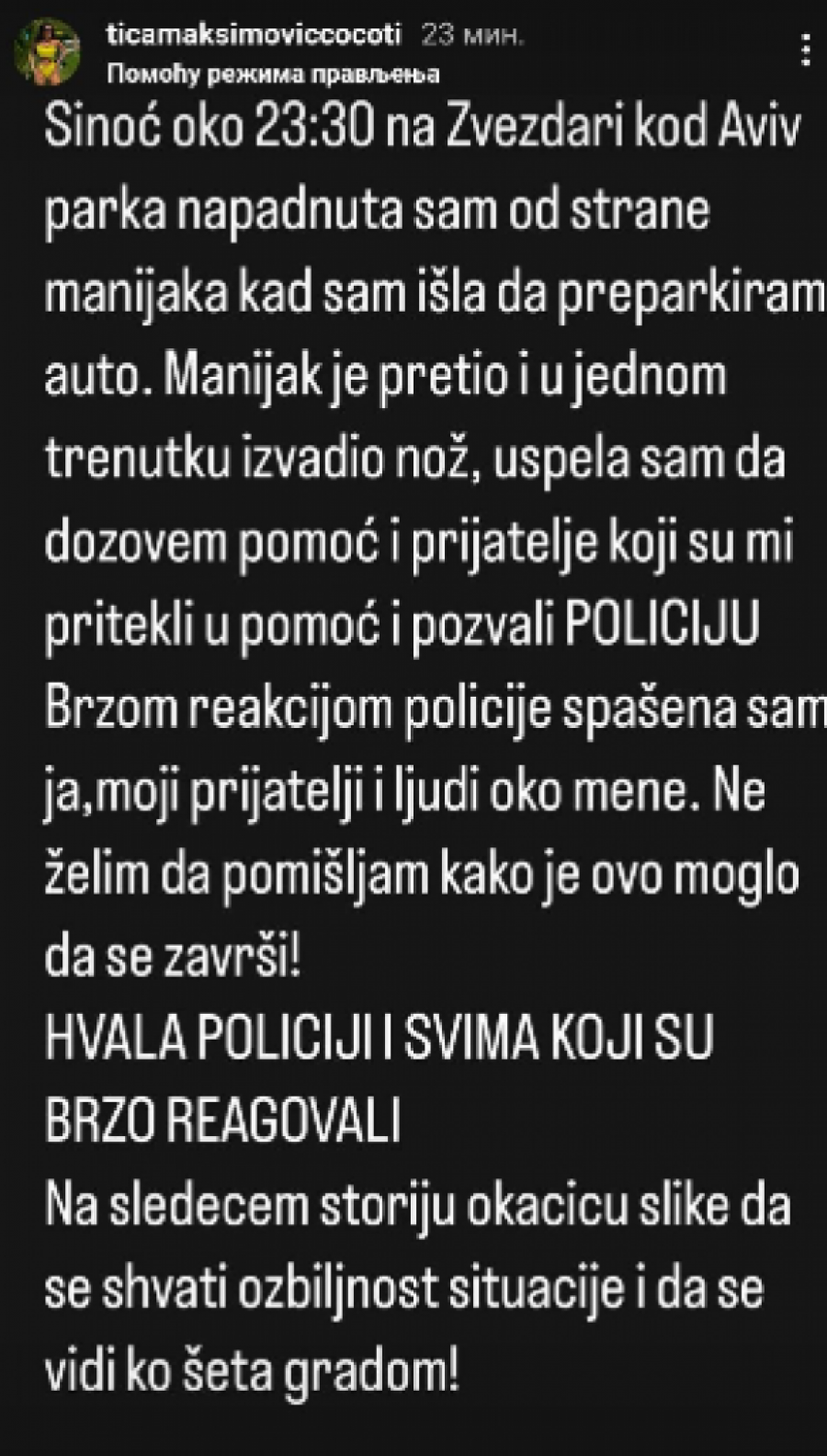 - Sinoć oko 23:30 na Zvezdari kod Aviv parka napadnuta sam od strane manijaka kad sam išla da preparkiram auto. Manijak je pretio i u jednom trenutku izvadio nož, uspela sam da dozovem pomoć i prijatelje koji su mi pritekli u pomoć i pozvali policiju. Brzom akcijom policije spasena sam ja, moji prijatelji i ljudi oko mene. Ne želim da pomišljam kako je ovo moglo da završi! Hvala policiji is vima koji su brzo reagovali.