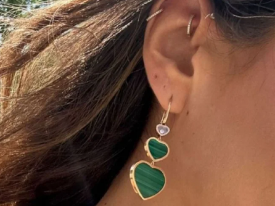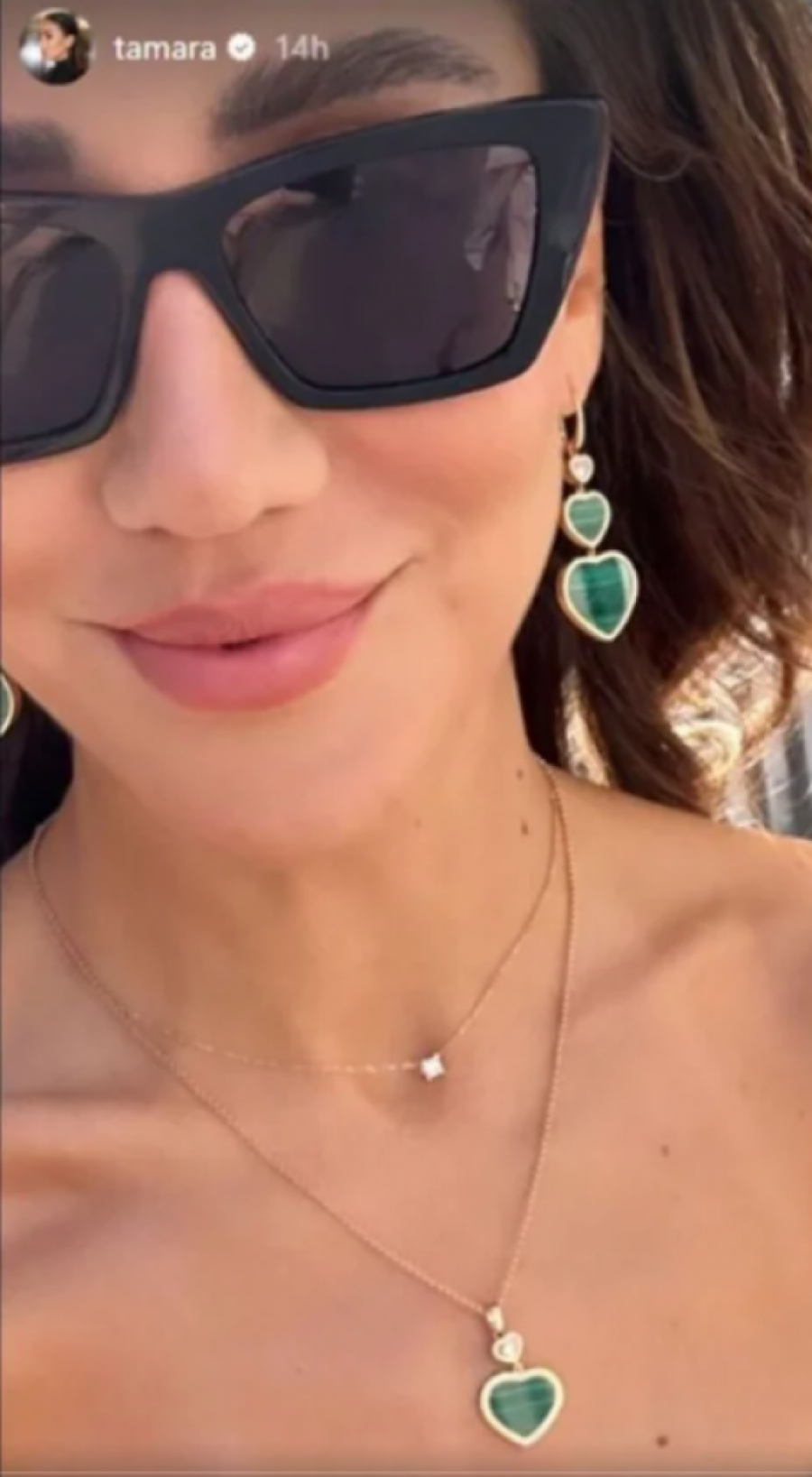Marka koju nosi je prepoznatljiva po obliku srca, kao i dijamantima. A ovi Tamarini komadi su od 18-karatnog roze zlata i zelenog kamena, a može se videti i blistavi dijamant, prenosi Blic.