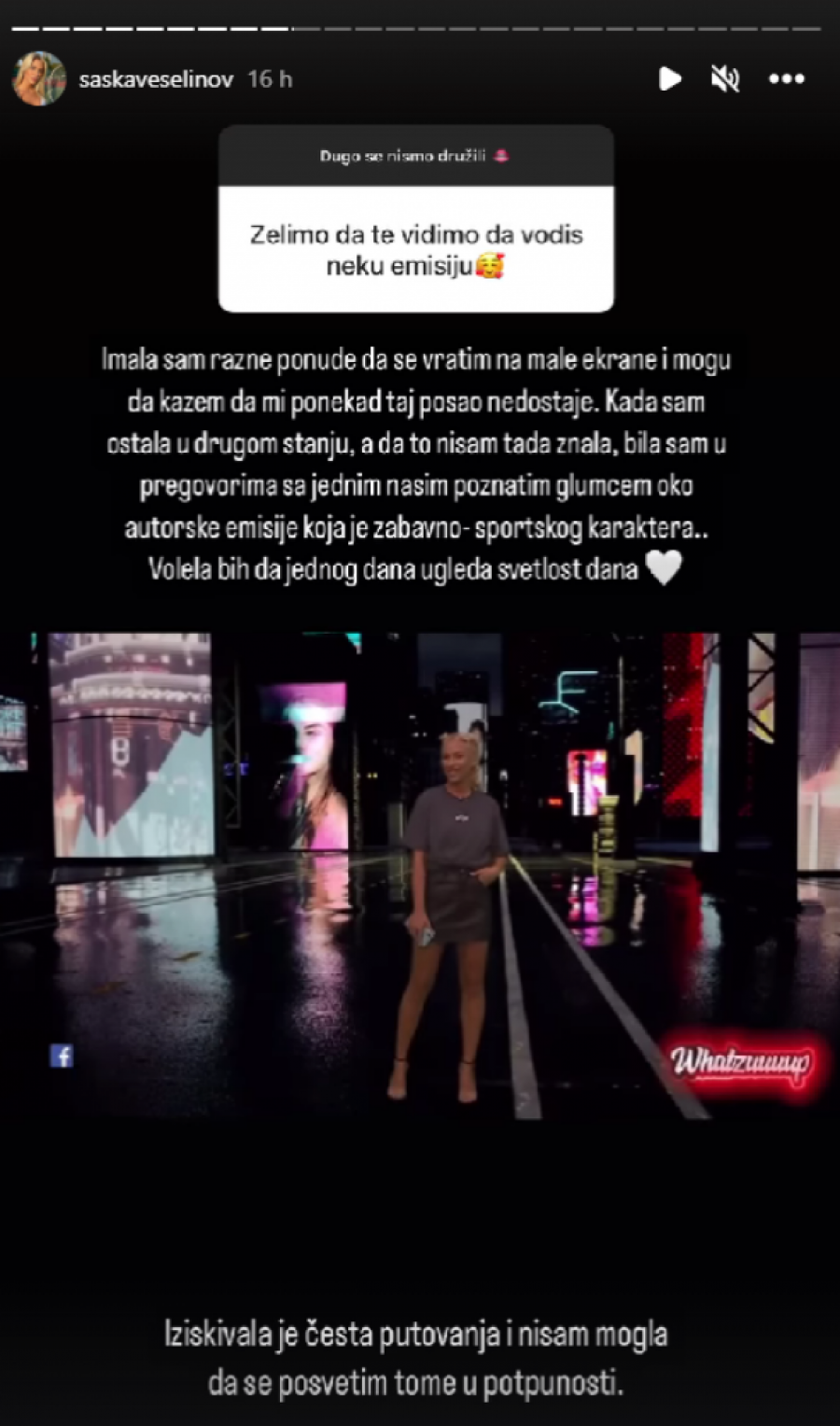 - Imala sam razne ponude da se vratim na male ekrane i mogu da kažem da mi ponekad taj posao nedostaje. Kada sam ostala u drugom stanju, a da to nisam ni tada znala, bila sam u pregovorima sa jednim našim poznatim glumcem oko autorske emisije koja je zabavno-sportskog karaktera. Volela bih da jednog dana ugleda svetlost dana - napisala je Saška na Instagramu.