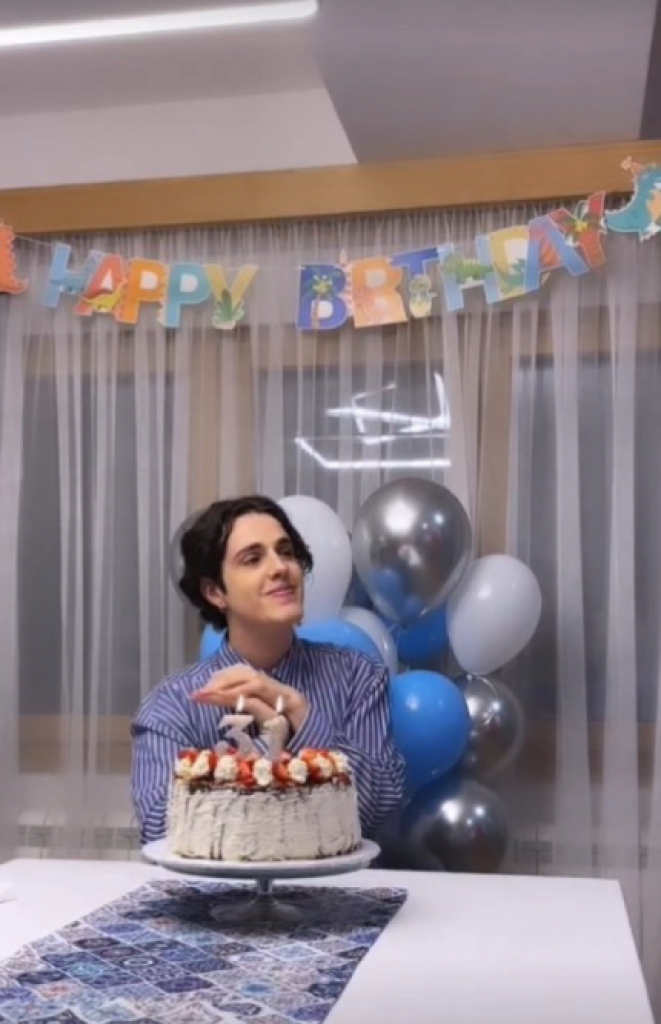 Iza Luke su se nalazili baloni u beloj, sivoj i plavoj boji, dok se ispred njega nalazila torta sa svećicama. Drugari su mu otpevali rođendansku pesmu, a onda se pojavila maskota sa likom Pepe Praseta, koja ga je zagrlila.