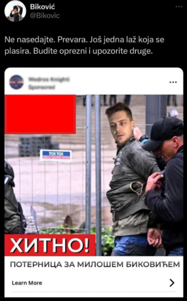 - Ne nasedajte. Prevara. Još jedna laž koja se plasira. Budite oprezni i upozorite druge - naveo je Biković.