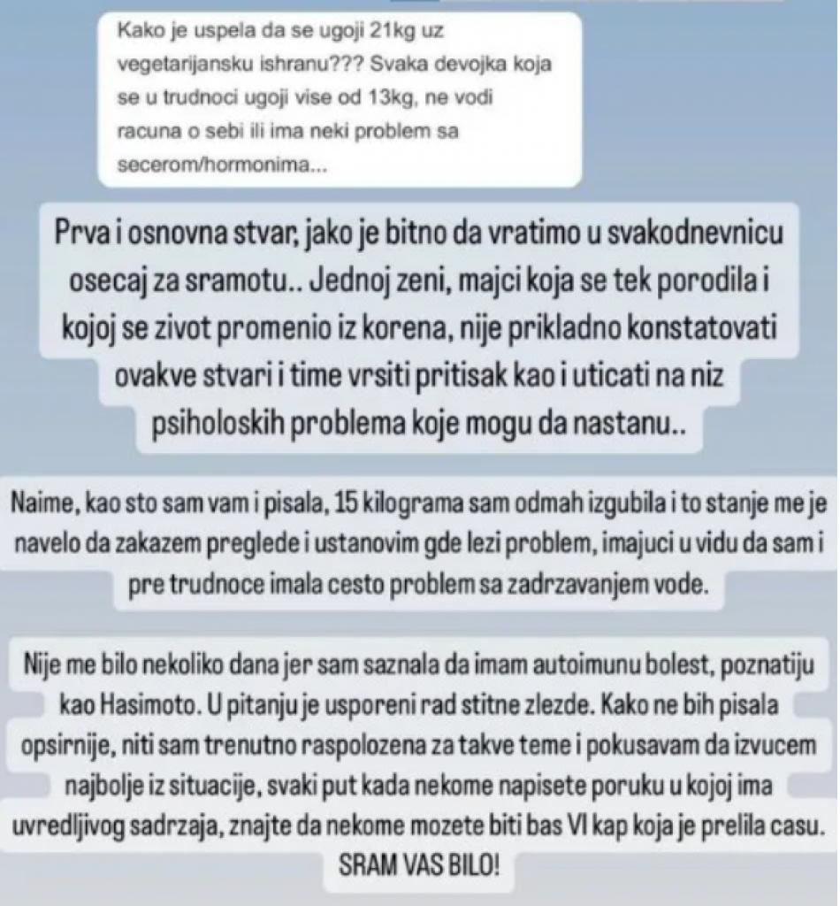 - Nije me bilo nekoliko dana jer sam saznala da imam autoimunu bolest, poznatiju kao Hašimoto. U pitanju je usporeni rad štitne žlezde. Kako ne bih pisala opširnije, niti sam trenutno raspoložena za takve teme i pokušavam da izvučem najbolje iz situacije, svaki put kada nekome napišete poruku u kojoj ima uvredljivog sadržaja, znajte da nekome možete biti baš vi kap koja je prelila čašu. Sram vas bilo! - poručila je ona.