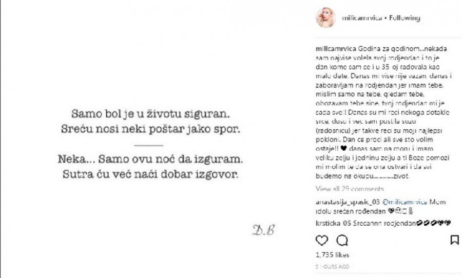 Foto: instagram.com/milicamrvicaBrojni komentari podrške i ohrabrenja su pristizali od strane pratioca Dabovićeve, čime se zaključuje da niko nije ostao ravnodušan na ove potresne reči samohrane majke.