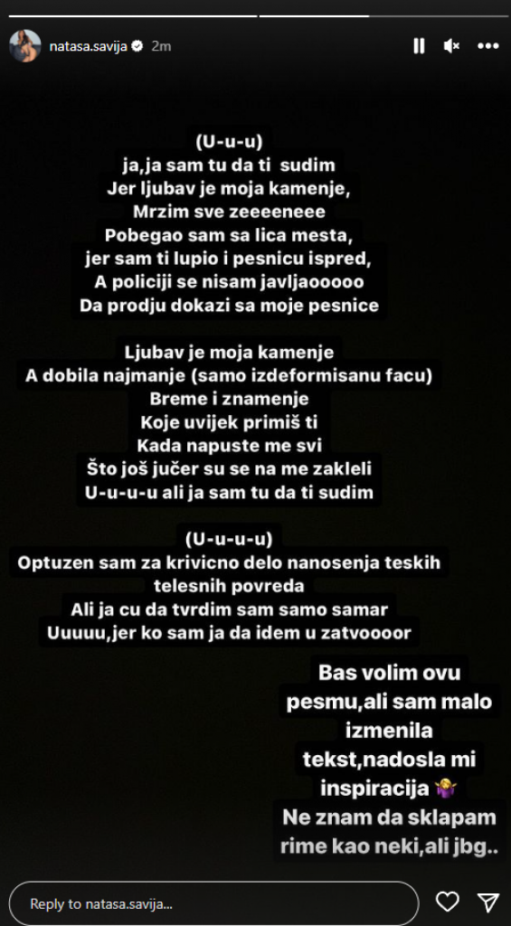 - Ja, ja sam tu da ti sudim. Jer ljubav je moja kamenje, mrzim sve žene, pobegao sam sa lica mesta, jer sam ti lupio šamar i pesnicu ispred, a policiji se nisam javljao, da prođu dokazi sa moje pesnice. Ljubav je moja kamenje, a dobila najmanje (samo izdeformisanu facu), breme i znamenje, koje uvek primiš ti, kada napuste me svi, što još juče su se na me zakleli. Optužen sam za krivično delo nanošenja teških telesnih povreda, ali ja ću da tvrdim samo za šamar, jer ko sam ja da idem u zatvor - napisala je Nataša.
