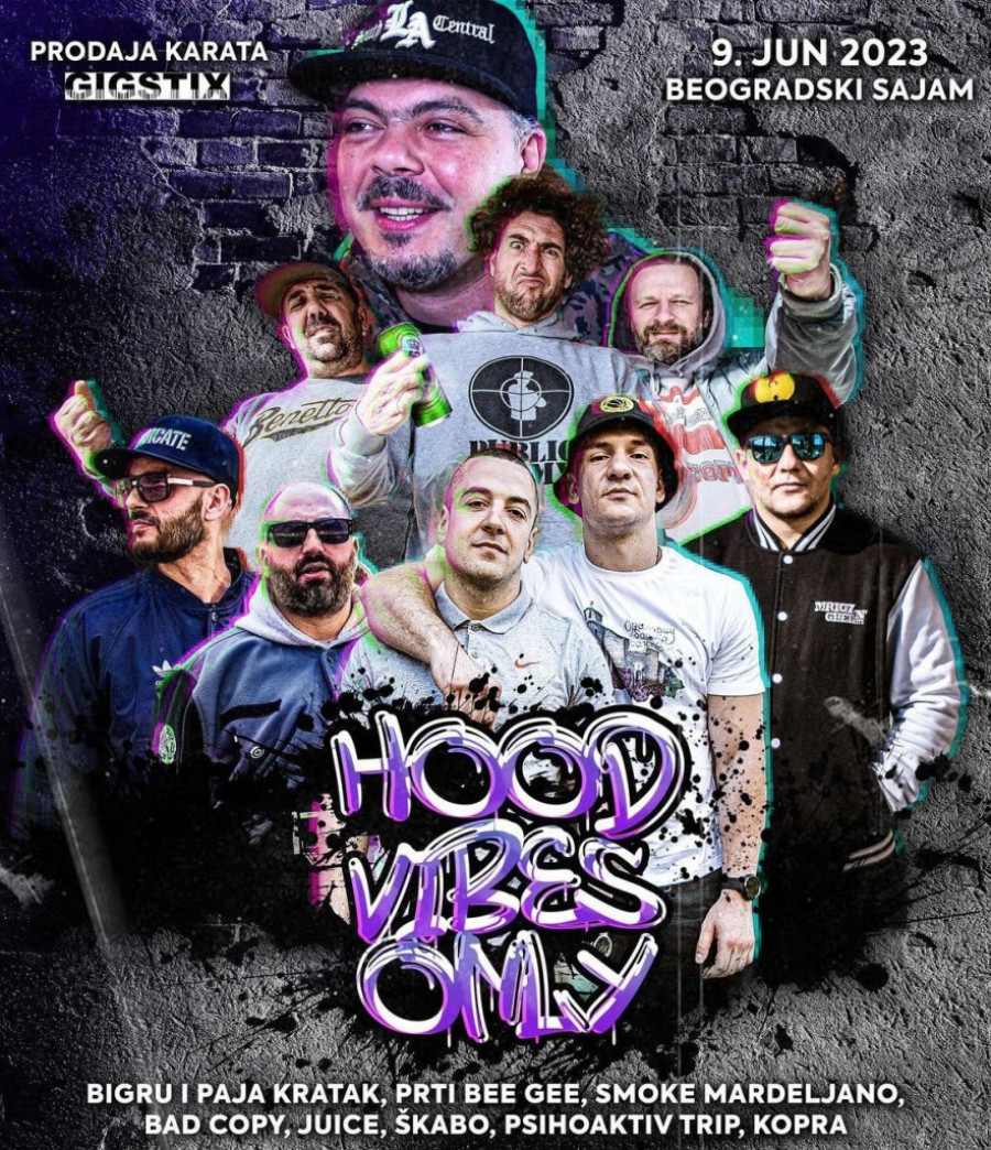 Kroz samo nekoliko dana, u petak 9. juna, festivalom Hood vibes only biće ispisana nova stranica istorije domaće rep muzike. Najveći festival do sada okupiće 14 repera, u prostoru Atrijum Beogradskog sajma će od 20 časova u petak nastupati Bigru i Paja Kratak, Smoke Mardeljano, Juice, Škabo, Bad Copy, Prti Bee Gee, Psihoaktiv trip i Kopra.