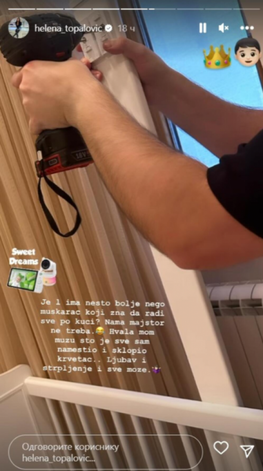 - Je l' ima nešto bolje, nego muškarac koji zna da radi sve po kući? Nama majstor ne treba. Hvala mom mužu što je sve sam namestio i sklopio krevetac. Ljubav i strpljenje i sve može - napisala je Helena.