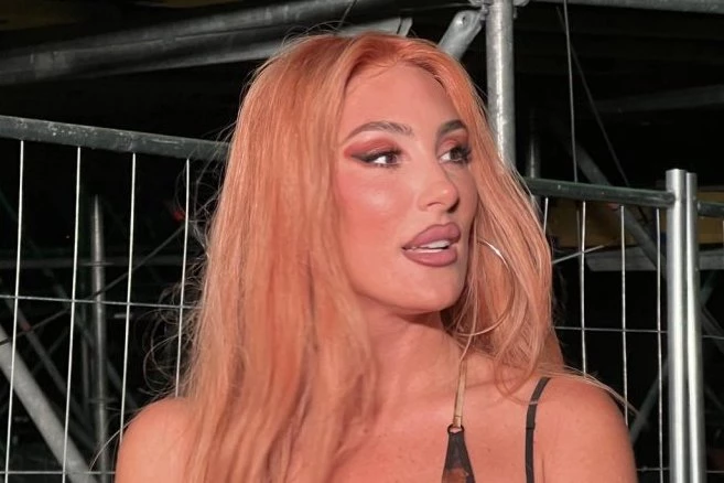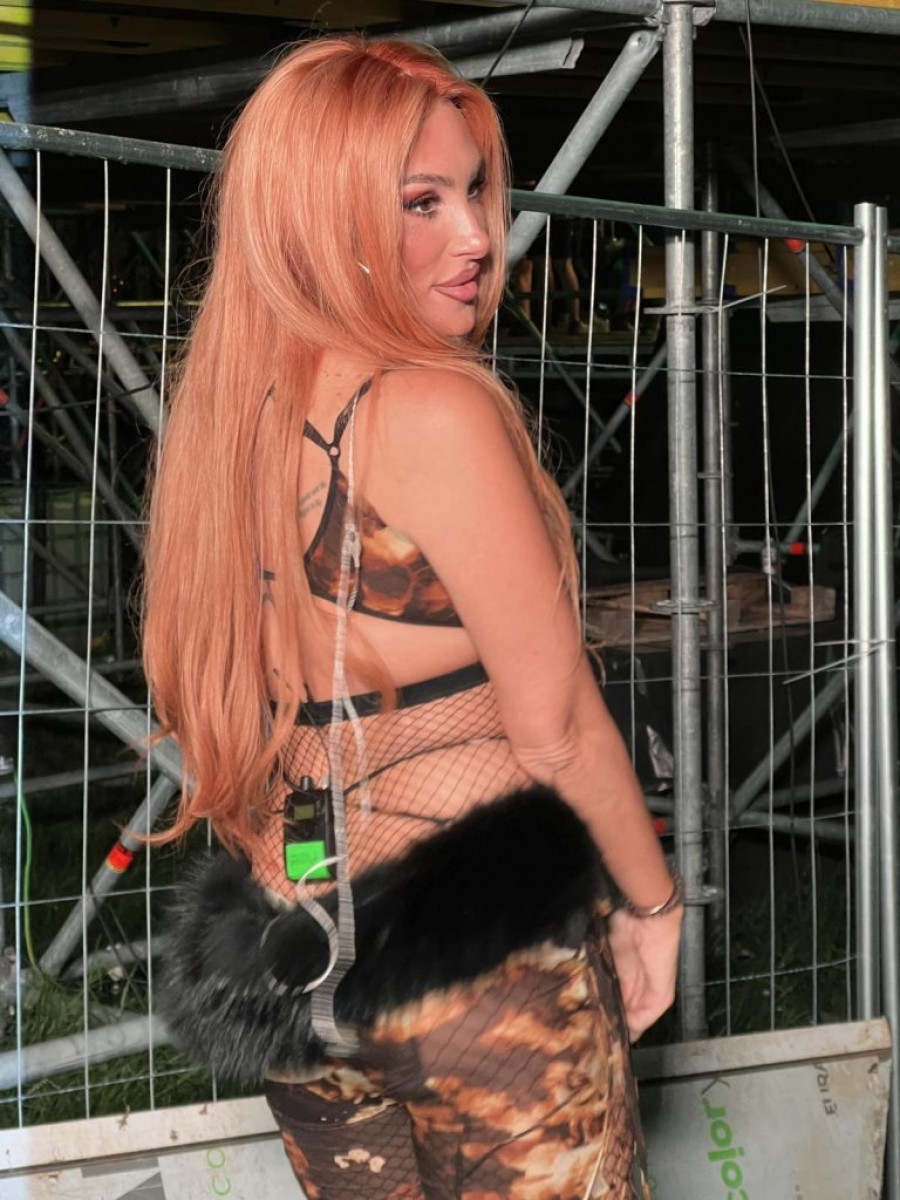 Senida je sinoć na Ušće došla sa dugom riđom kosom, gornjim delom nalik na kupaći kostim, pantalonama istog dezena i sva u mreži, dok je na njenoj zadnjici bilo krzno. Ipak, ono što je mnogima zapalo za oko jeste crni flaster na njenom izvajanom stomaku.