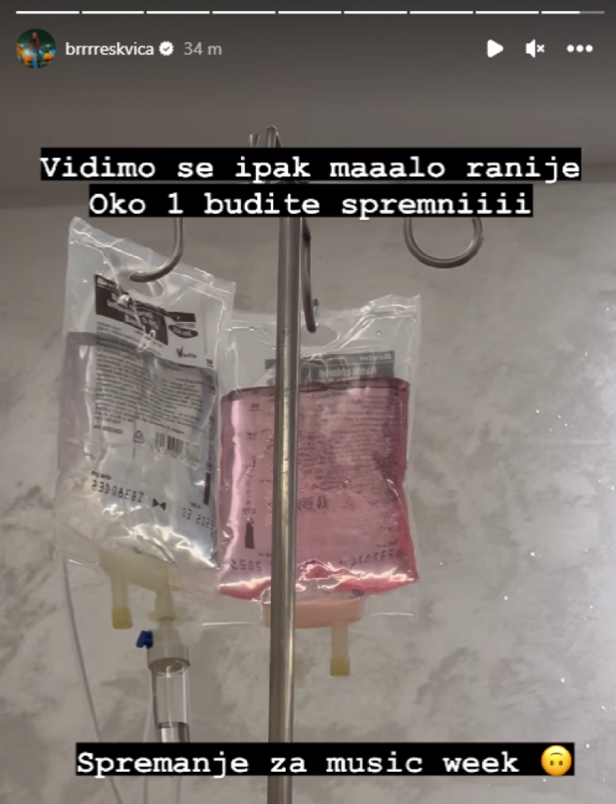 Pevačica Anđela Ignjatović poznatija kao Breskvica večeras će nešto iza ponoći nastupiti na Belgrade Music Week festivalu. Međutim, ona je na Instagramu digla veliku dramu, kada je objavila da je priključena na infuziju.