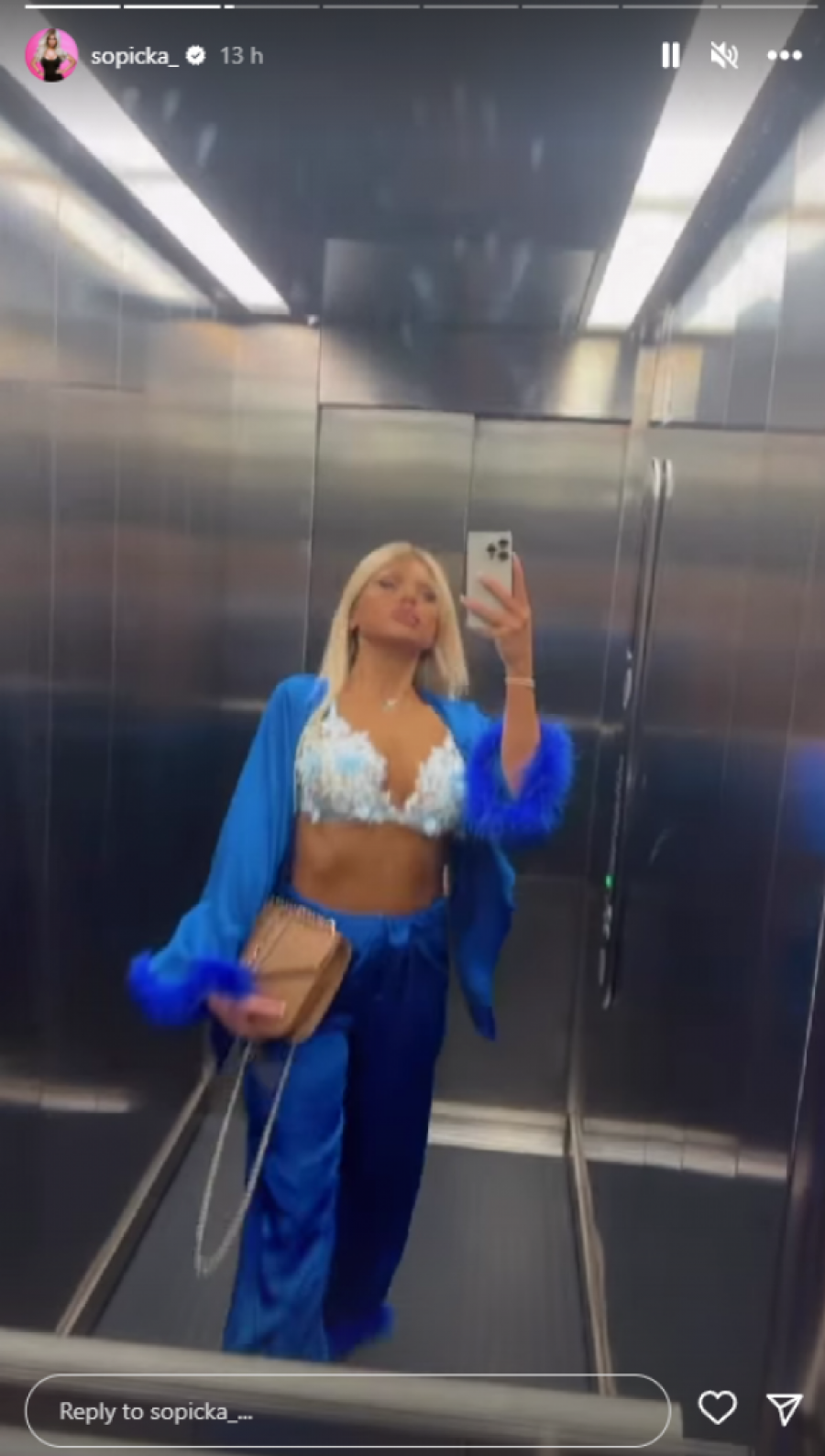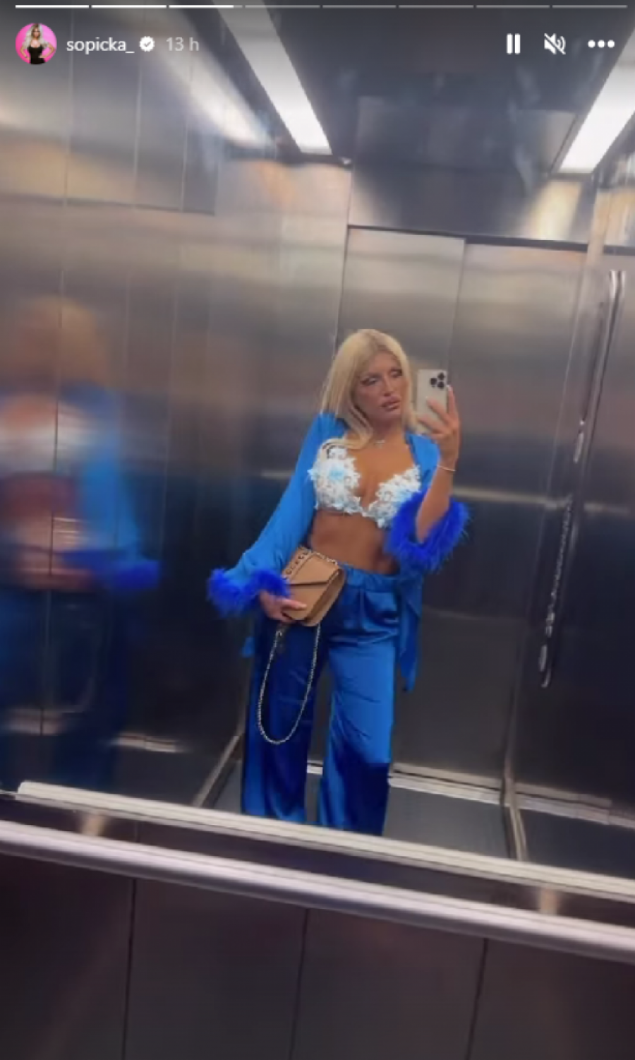 Šopićeva je u noćni provod krenula u dekorativnom brusu, koji je istakao njene bujne silikone, a na sebi je imala samo plavo odelo, koje je isticalo njenu figuru.