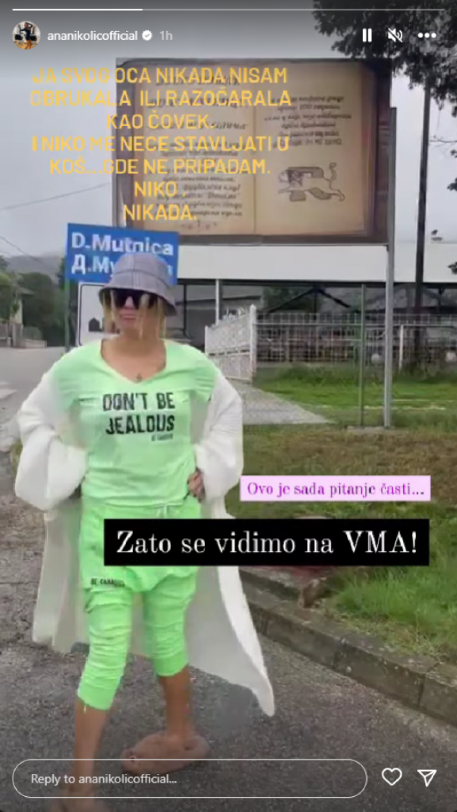 - Ja svog oca nikada nisam obrukala niti razočarala kao čovek. I niko me neće stavljati u koš gde ne pripadam. Niko. Nikada. Ovo je sada pitanje časti. I zato, vidimo se na VMA - napisala je pevačica u opisu storija.