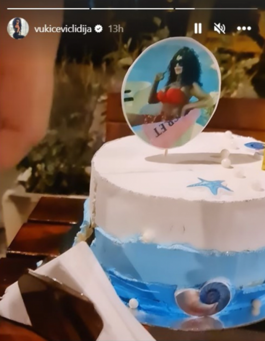 Lidija je isekla i specijalnu tortu iznenađenja, ukrašenu morskim motivima. Ono što je svima privuklo pažnju jeste glumičina fotografija na torti.