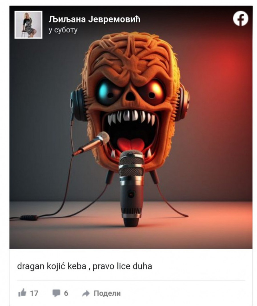 Tako je i poslednjom objavom na Fejsbuku pokazala koliko je ogorčena na oca svog deteta, pa je postavila fotografiju lobanje sa demonskim očima koja peva i napisala: