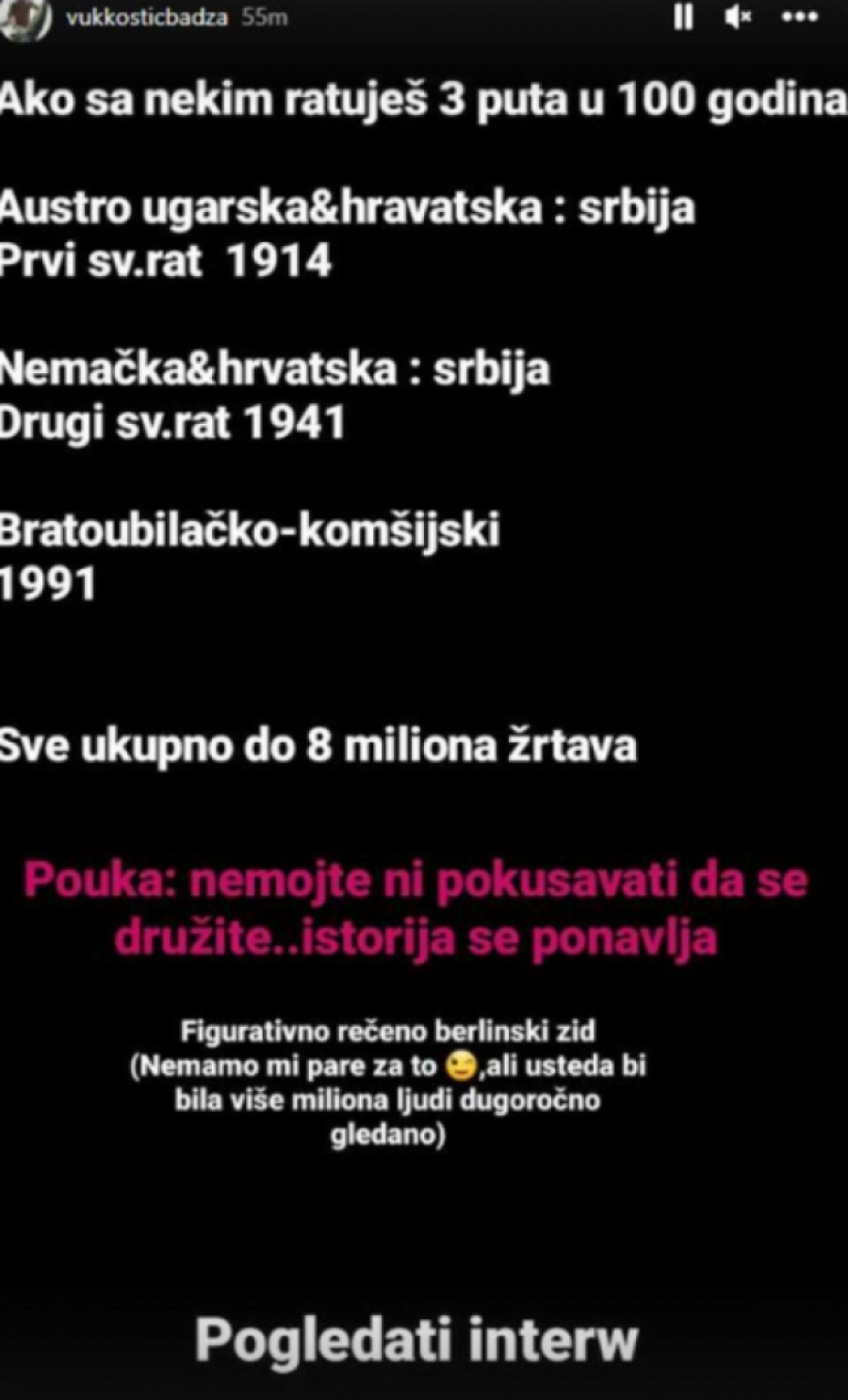 - Ako sa nekim ratuješ tri puta u 100 godina. Austrougarska i Hrvatska: Srbija, Prvi Svetski rat 1914. godina. Nemačka i Hrvatska: Srbija – Drugi svetsi rat 1941. godine. Bratoubilačko-komšijski rat 1991. godina. Sve ukupno osam miliona žrtava. Poruka – Nemojte ni pokušavati da se družite, istorija se ponavlja - napisao je glumac i dodao: