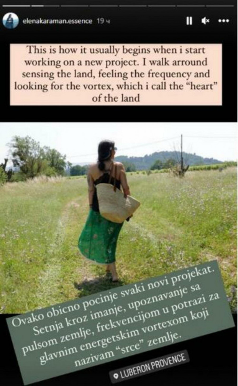 - Ovako obično počinje svaki novi projekat. Šetnja kroz imanje, upoznavanje sa pulsom zemlje, frekvencijom u potrazi za glavnim energetskim vorteksom, koji nazivam "srce" zemlje - napisala je Elena, pa nastavila dalje da pokazuje delove luksuznog imanja.