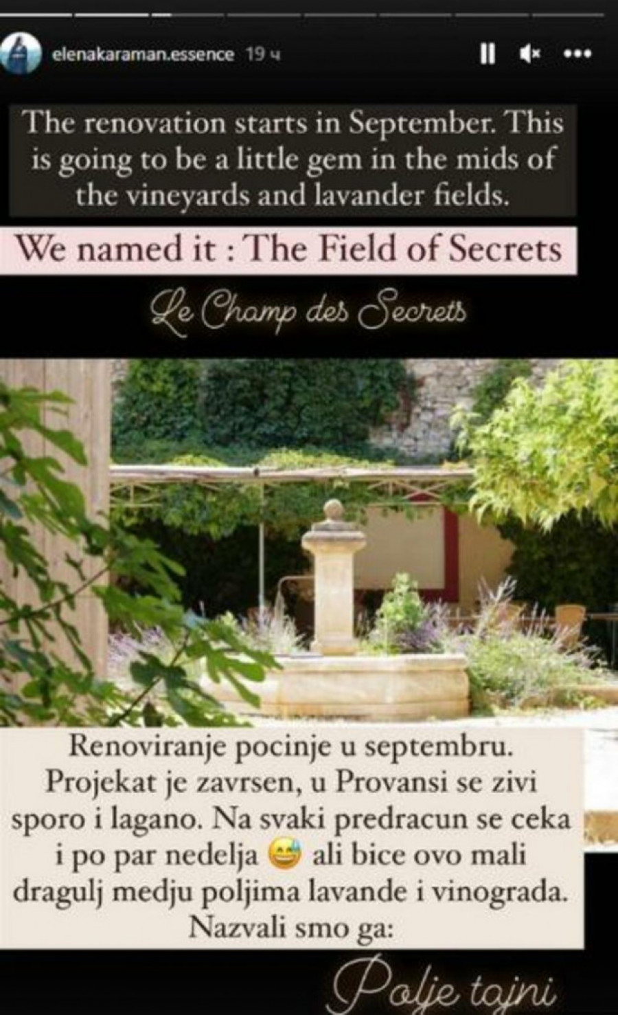- Renoviranja počinje u septembru. Projekat je završen. U Provansi se živi sporo i lagano. Na svaki predračun se čeka i po par nedelja, ali biće ovo mali dragulj među poljima lavande i vinograda. Nazvali smo ga: Polje tajni - napisala je Elena, ali tu se nije zaustavila, već je pokazala i štalu, koja će joj između ostalog služiti za rituale.