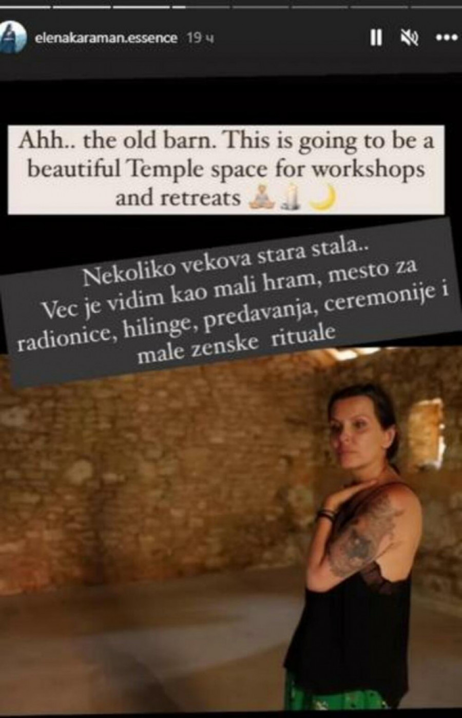- Nekoliko vekova stara štala. Već je vidim kao mali hram, mesto za radionice, hilinge, predavanja, ceremonije i male ženske rituale - otkrila je Elena.