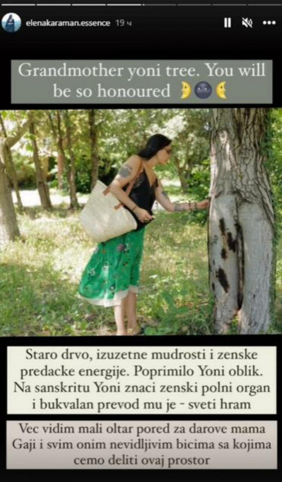 - Staro drvo, izuzetne mudrosti i ženske predačke energije. Poprimilo Yoni oblik. Na sanskritu Yoni znači ženski polni organ i bukvalan prevod mu je sveti hram. Već vidim mali oltar pored za darove mama Gaji i svim onim nevidljivim bićima sa kojima ćemo deliti ovaj prostor - objasnila je Elena, pa se zatim osvrnula na unutrašnjost novog doma.