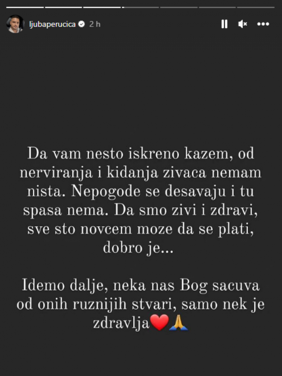 - Da vam nešto iskreno kažem, od nerviranja i kidanja živaca nemam ništa. Nepogode se dešavaju i tu spasa nema. Da smo živi i zdravi, sve što novcem može da se plati, dobro je... Idemo dalje, neka nas Bog sačuva od onih rzžnijih stvari, samo nek je zdravlja - napisao je Ljuba.
