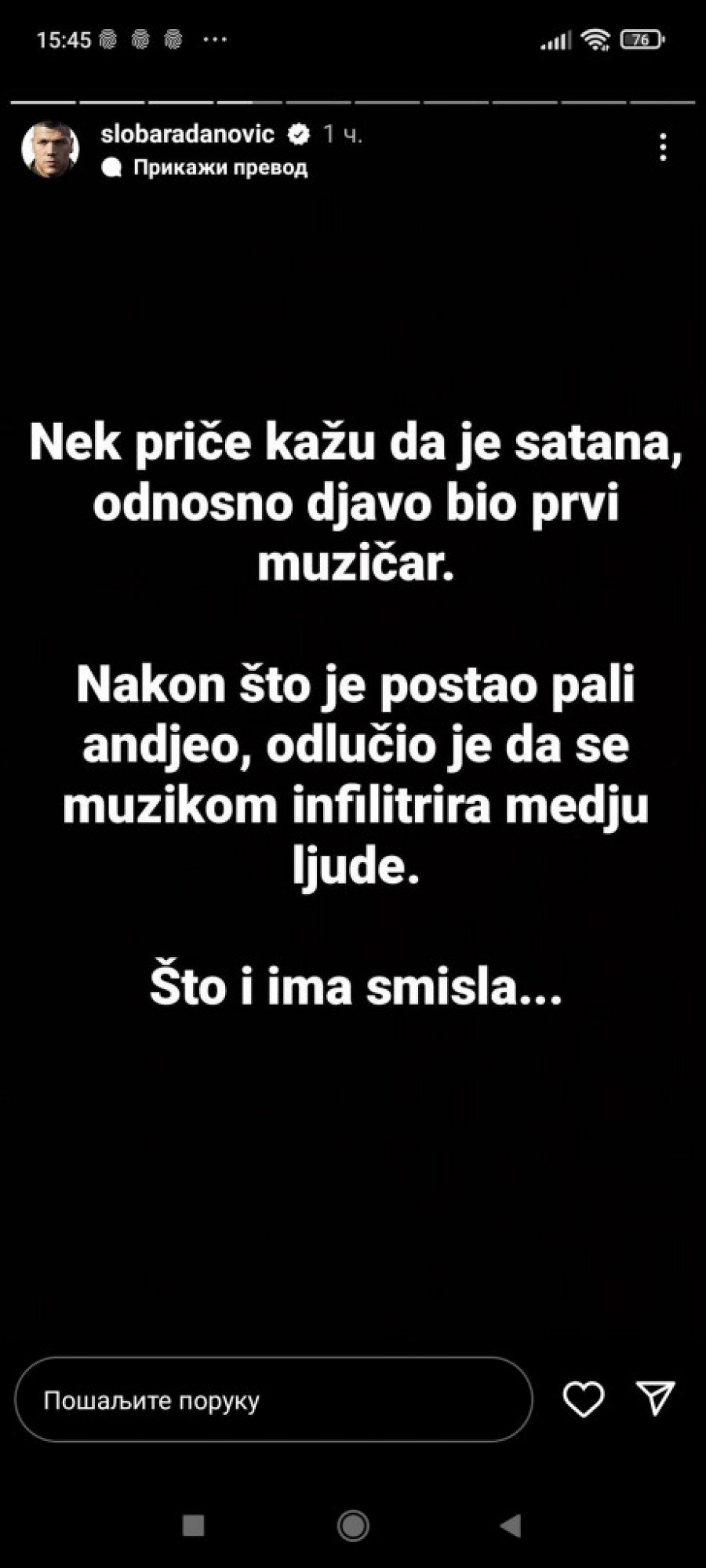 - Neke priče kažu da je satana, odnosno đavo bio prvi muzičar. Nakon što je postao pali anđeo, odlučio je da se muzikom infiltrira među ljude, što ima smisla. - napisao je pevač pa nastavio: