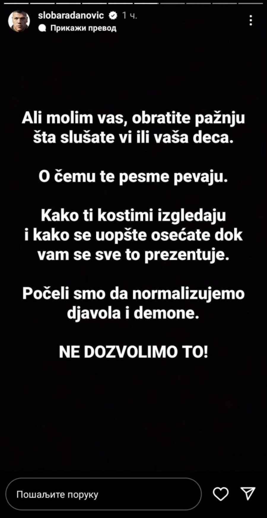 - Ali molim vas, obratite pažnju šta slušate vi ili vaša deca. O čemu te pesme pevaju. Kako ti kostimi izgledaju i kako se uopšte osećate dok vam se sve to prezentuje. Počeli smo da normalizujemo đavole i demone. Ne dozvolimo to! - napisao je Radanović.